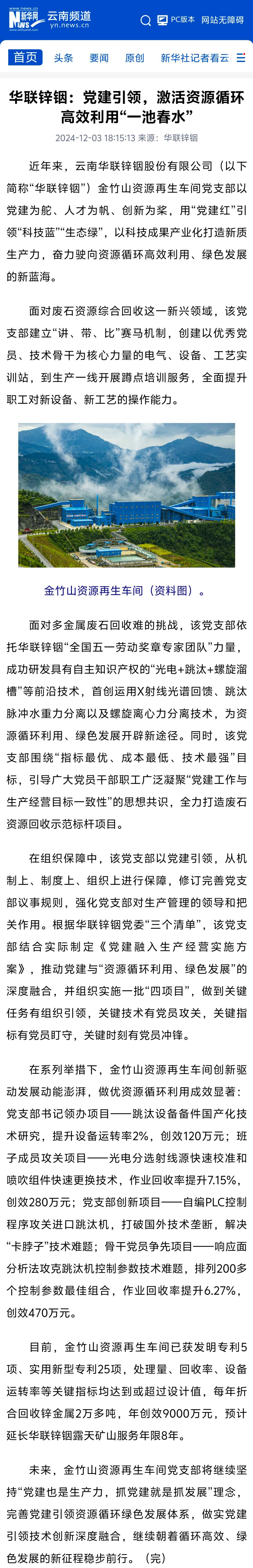 新華網(wǎng):華聯(lián)鋅銦黨建引領(lǐng),激活資源循環(huán)高效利用“一池春水”